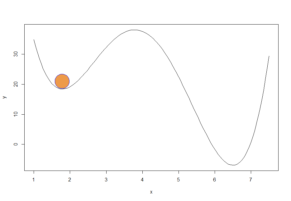 Here we see a plot of a polynomial. The brown ball sits in a local minimum; any small jiggle can only push the ball up. If the language of physics, the ball has found an equilibrium point. In the language of ML algorithms, we have minimized the loss function. Neither the ball nor the algorithm know there is a smaller and better minimum sitting right nearby.